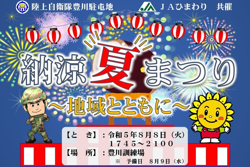 陸上自衛隊 日本原駐屯地 「令和5年度 日本原駐屯地 納涼大会」 8月3日(木) 一般開放:18:00-20:30 詳細は不明。例年なら、大道芸・歌謡ショー・和太鼓演奏・盆踊り・キッズダンスetc 「荒天時および災害派遣時は、中止します。」 |